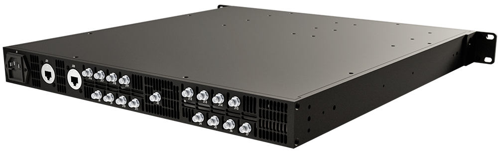 The NDR888 is a wide band, 8 channel, microwave tuner platform that provides frequency coverage from 20 MHz to 18 GHz. Each channel provides a 1 GHz analog IF output with a 500 MHz instantaneous bandwidth. The 8 channels can tune both independently and phase coherently. It employs a super-heterodyne RF conversion architecture to minimize spurious products and yield high dynamic range performance. The fully integrated synthesizers provide fast tuning, low phase noise and the tuning flexibility to choose an alternative IF output center frequency (an IF different than 1 GHz) if desired. The unit includes an internal 100 MHz OCXO and accepts a 10 MHz reference input.